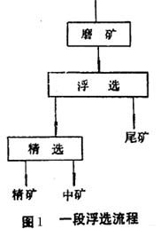 乐发IIIV 选择浮选原则流程的任务,在于解决浮选流程的段数和有用矿物的浮选顺序问题。实践中,以磨矿段数与浮选作业连系来划分浮选的段数。一般可以分为一段浮选流程和阶段磨矿阶段选别流程。将矿石一次磨到选别所需要的粒度,然后经浮选得到最终精矿的浮选流程,称为一段浮选流程(图1);